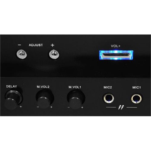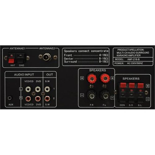 • Connections: 2 x 6.3 mm jack, microphone input (front), 2x RCA stereo line input, 1 x 3.5mm mini-jack auxiliary input (front), 2 x set of screw terminals for connecting the front Speakers, 3 x set of terminals for connecting the stereo surround speakers, 1 x RCA output for connecting the powered subwoofer